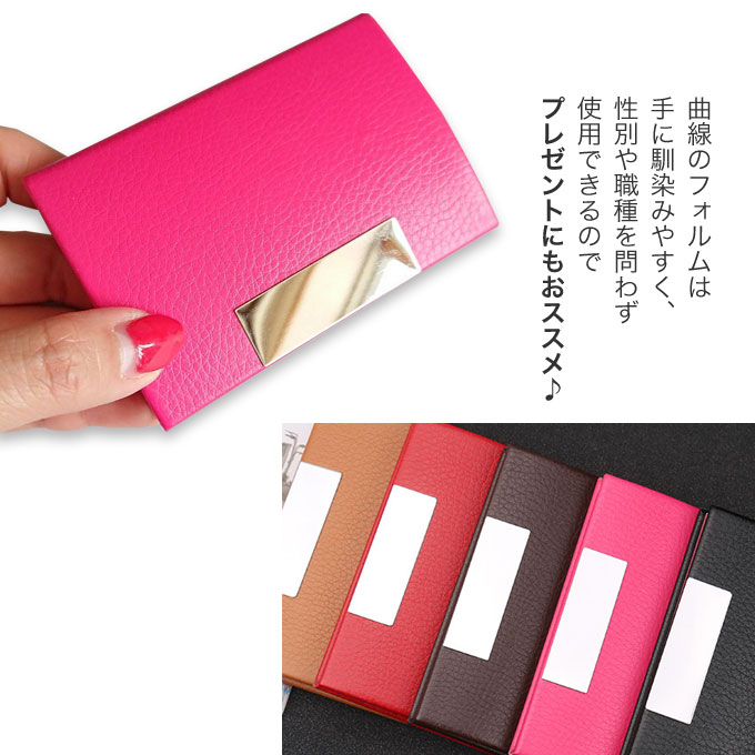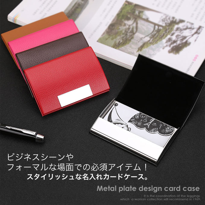 名刺入れ レディース かわいい カードケース メンズ おしゃれ 【メール便送料無料02】 フェイクレザー カード入れ スリム 春 シンプル ギフト プレゼント ハードケース コンパクト ステンレス 革風 合皮 ピンク 赤 黒 PUレザー シルバー 就職ラッキーシール 対応 [case-024]